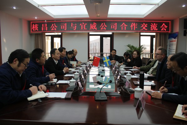 首先,宜威公司張聯庫、朗尼·埃里克森、尤納斯·阿格倫一行在公司領導班子的陪同下參觀了生產車間、辦公場所和職工食堂,使外方代表對公司環境做了初步了解。在隨后的合作交流會上,董事長王超宏介紹了公司歷史演變、人員結構、產業布局、未來發展方向等方面的情況,同時就與宜威公司的合作表明了態度。地源熱泵項目組組長張聯庫對與核昌公司的合作事宜作了敘述,隨后,雙方對合作的一些具體事項進行了商談,最后達成共識,簽署了合作意向書。