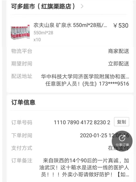 1月23日,疫情蔓延呈上漲趨勢(shì),武漢“封城”后物資匱乏,各地各鎮(zhèn)府人民紛紛送去了物資力量,中陜核集團(tuán)核昌黨委工作部幾位青年們亦立即行動(dòng)起來,通過朋友圈、微信群、QQ群等渠道,組織號(hào)召朋友、家人參與進(jìn)來,開展捐款購(gòu)買礦泉水活動(dòng),送往武漢華中科技大學(xué)同濟(jì)醫(yī)學(xué)院附屬協(xié)和醫(yī)院金銀湖分院,大家快速行動(dòng),活動(dòng)共捐助10箱280瓶礦泉水。小小的280瓶,帶著核昌青年及家人朋友對(duì)武漢同胞的祝福、對(duì)全體一線奮戰(zhàn)醫(yī)務(wù)人員的敬意、對(duì)國(guó)家抗擊疫情成功的信心前去抗疫一線,這份小小的力量有我們大大的祝福,希望能幫到他們,盼望正在一線奮斗患者和醫(yī)務(wù)人員都能平安歸來。