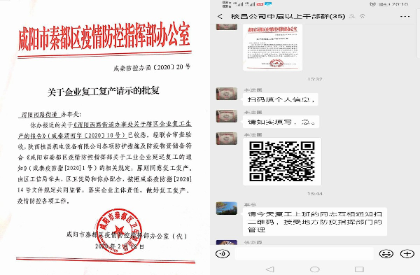 2月19日,核昌公司在不斷加強新型冠狀病毒疫情防控工作的基礎上。根據集團公司復工復產相關要求,經咸陽市秦都區疫情防控指揮部辦公室批準,結合公司自身實際情況,自2月19日起恢復工作與生產并做好咸陽市疫情企業復工復產登記工作。